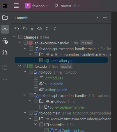위 사진에서 api-exception-handelr라는 submodule을 커밋하면, foxtodo라는 main project는 api-exception-handelr의 d7f5005c~ 커밋을 submodule의 수정사항으로써 추적하게 된다.