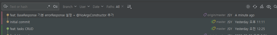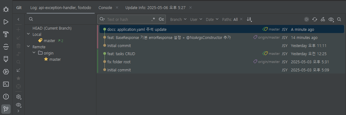 update가 잘 되었다면 local branch가 원격 branch와 sync된 것을 확인할 수 있다.