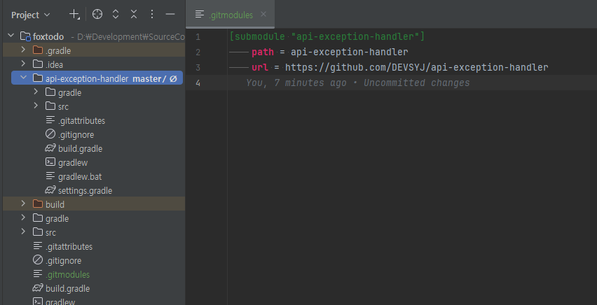 submodule이 잘 추가되었다면 프로젝트 루트에 .gitmodules 파일이 생긴 것을 확인할 수 있다.